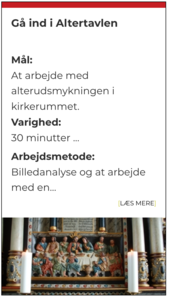 At sætte sig foran kirkens altertavle er indholdsmæssigt i høj grad betinget af lokale forhold, men fælles for dem er at de bærer på en fortælling og ofte også en række symboler. Derfor må dette forløb tilpasses efter egne forhold.