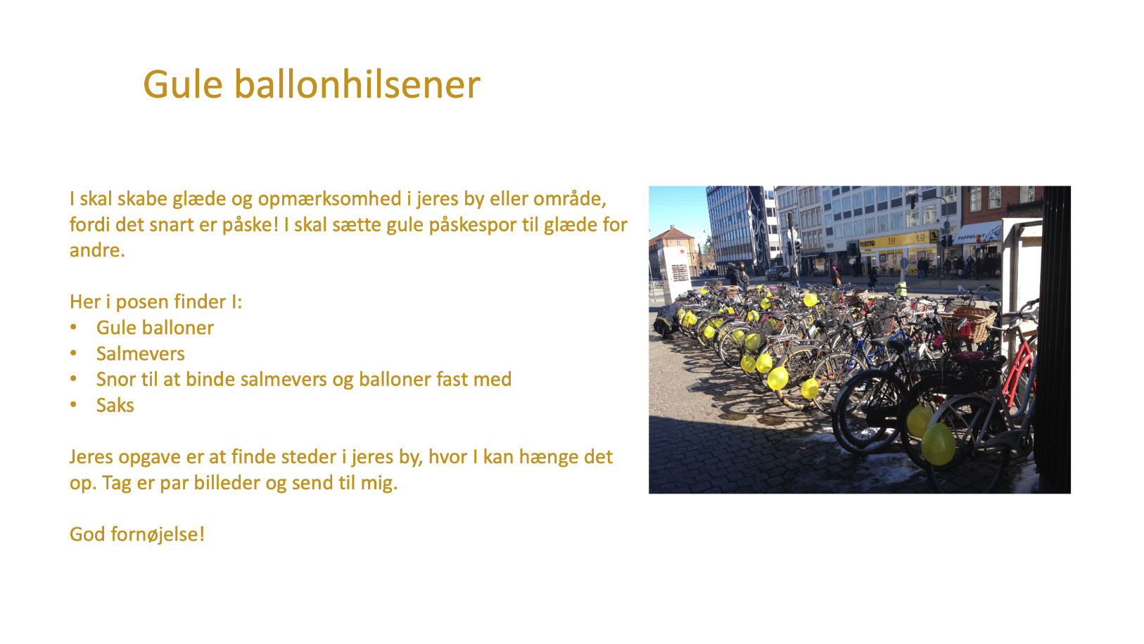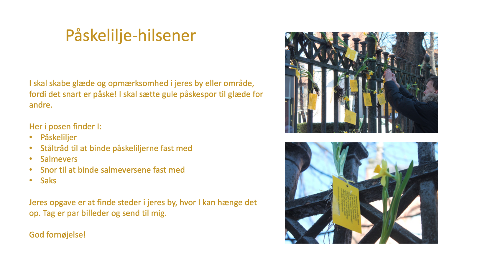 - Hver konfirmand skal enten have udleveret eller komme forbi hos dig og hente en pose med indhold, de skal bruge til den aktivitet, de skal udføre. I posen ligger også en beskrivelse af deres opgave. De kan udføre den enkeltvis eller i gruppen.
